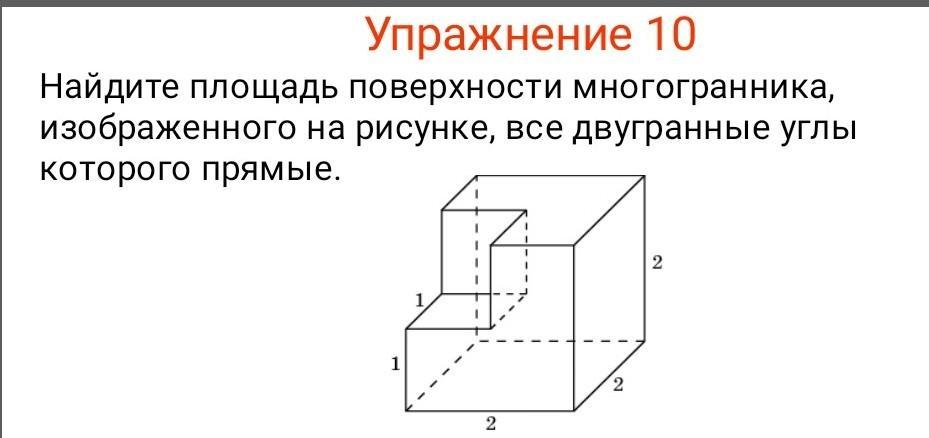 Найдите площадь поверхности многогранника, изображенного на рисунке, все двугранные углы которого прямые.