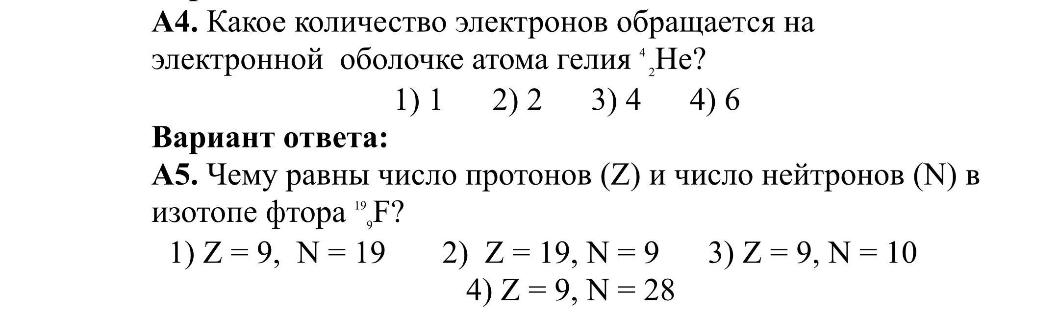 А4. Какое количество электронов обращается на электронной оболочке атома гелия ⁴₂Не?