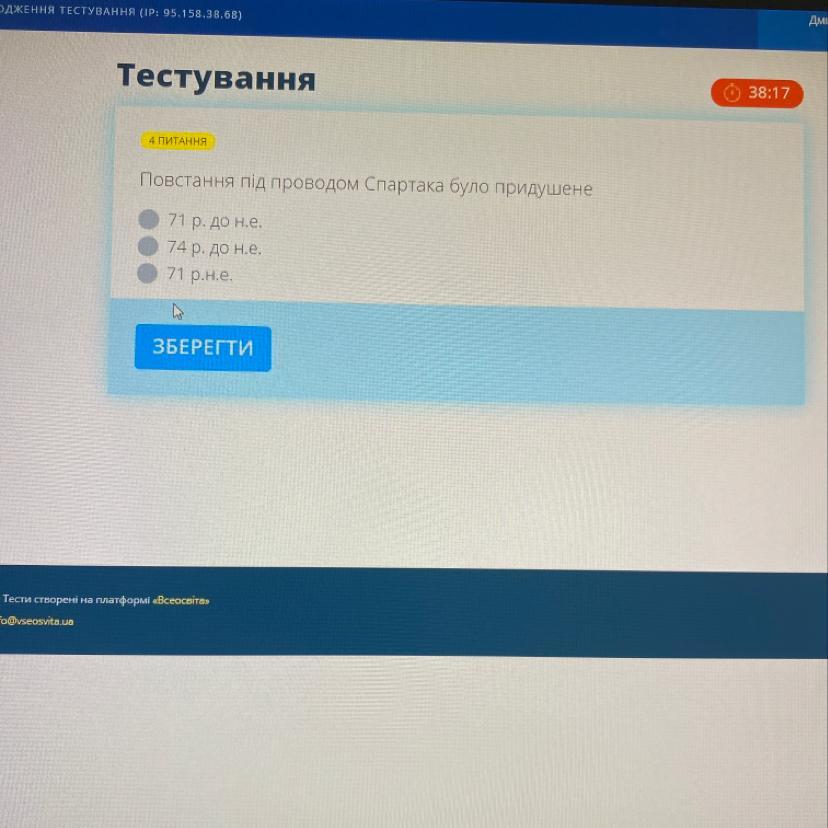 Объяснение: Повстання рабів під проводом Спартака (лат. Bellum Spartacium або лат. Tertium Bellum Servile, «Третя війна з рабами») — найбільше в давнину і третє за ліком (після першого і другого Сицилійських повстань) повстання рабів. Останнє повстання рабів у Римській республіці датується звичайно 74 (або 73) — 71 рр. до н. е. Повстання Спартака було єдиним повстанням рабів, яке несло пряму загрозу центральної Італії. Остаточно придушене в основному завдяки військовим зусиллям полководця Марка Ліцинія Красса. У наступні роки воно продовжувало надавати непрямий вплив на політику Риму.