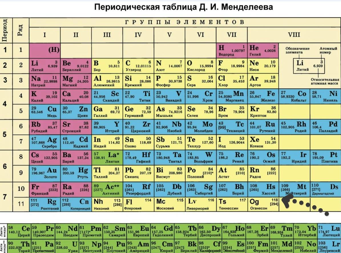 Периодическая система химических элементов Дмитрия Ивановича Менделеева включает в себя 118 элементов.