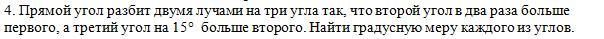 Пусть первый угол равен x°, тогда второй угол равен 2x°, а третий угол равен (2x°+15°). Всего 90°. Составим и решим уравнение.