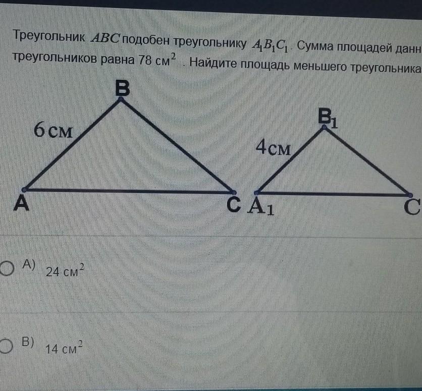 треугольник АВС подобен треугольнику А1В1С1 сумма площадей треугольников равна 78см². Найдите площадь меньшего треугольника.