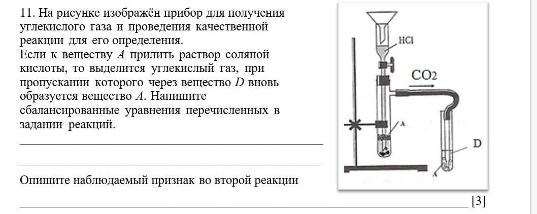 На рисунке изображён прибор для получения углекислого газа и проведения качественной реакции для его определения.