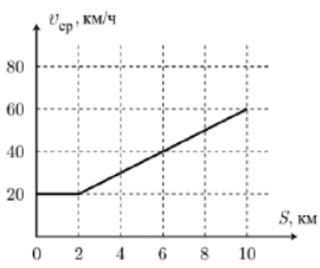 На первом участке пути автомобиль ехал с постоянной скоростью 20 км/ч, а на втором участке его скорость увеличивалась. На рисунке изображен график зависимости средней скорости автомобиля от пройденного пути. Во сколько раз время движения на первом участке больше времени движения на втором участке?