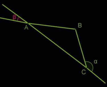 Так как расстояния ВА и ВС одинаковы, следовательно, треугольник равнобедренный. Углы α - внешний угол треугольника и в сумме с внутренним углом C, смежным с ним, составляет 180°. Следовательно, <C = 180°-152°=28°.