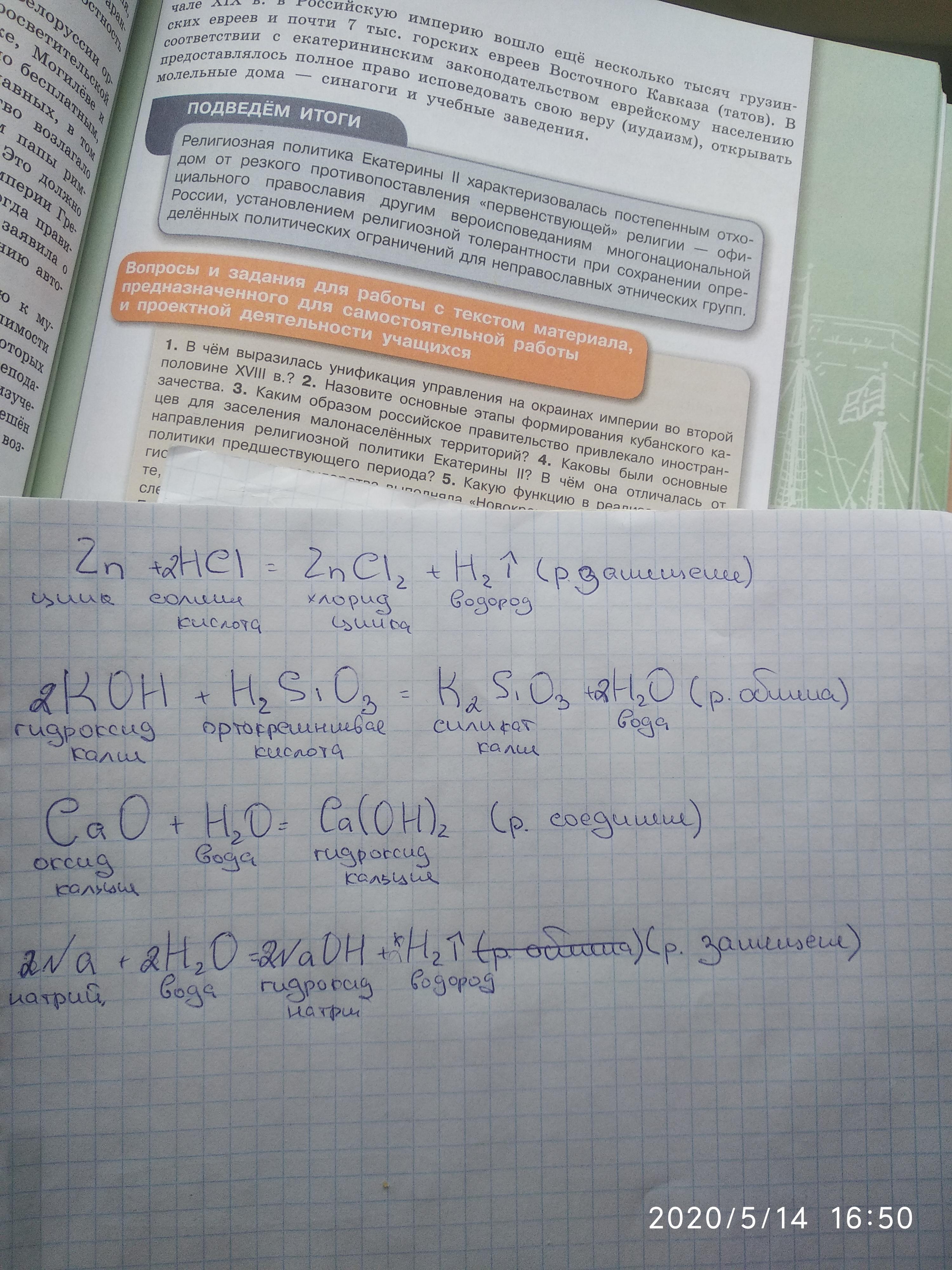 Уравнять и назвать тип реакции ,под реакцией подписать названия веществ:а) Zn + HCl = ZnCl2 + H2; б) KOH + H2SiO3 = K2SiO3 + H2O; в) CaO + H2O = Ca(OH)2; г) Na + H2O = NaOH + H2