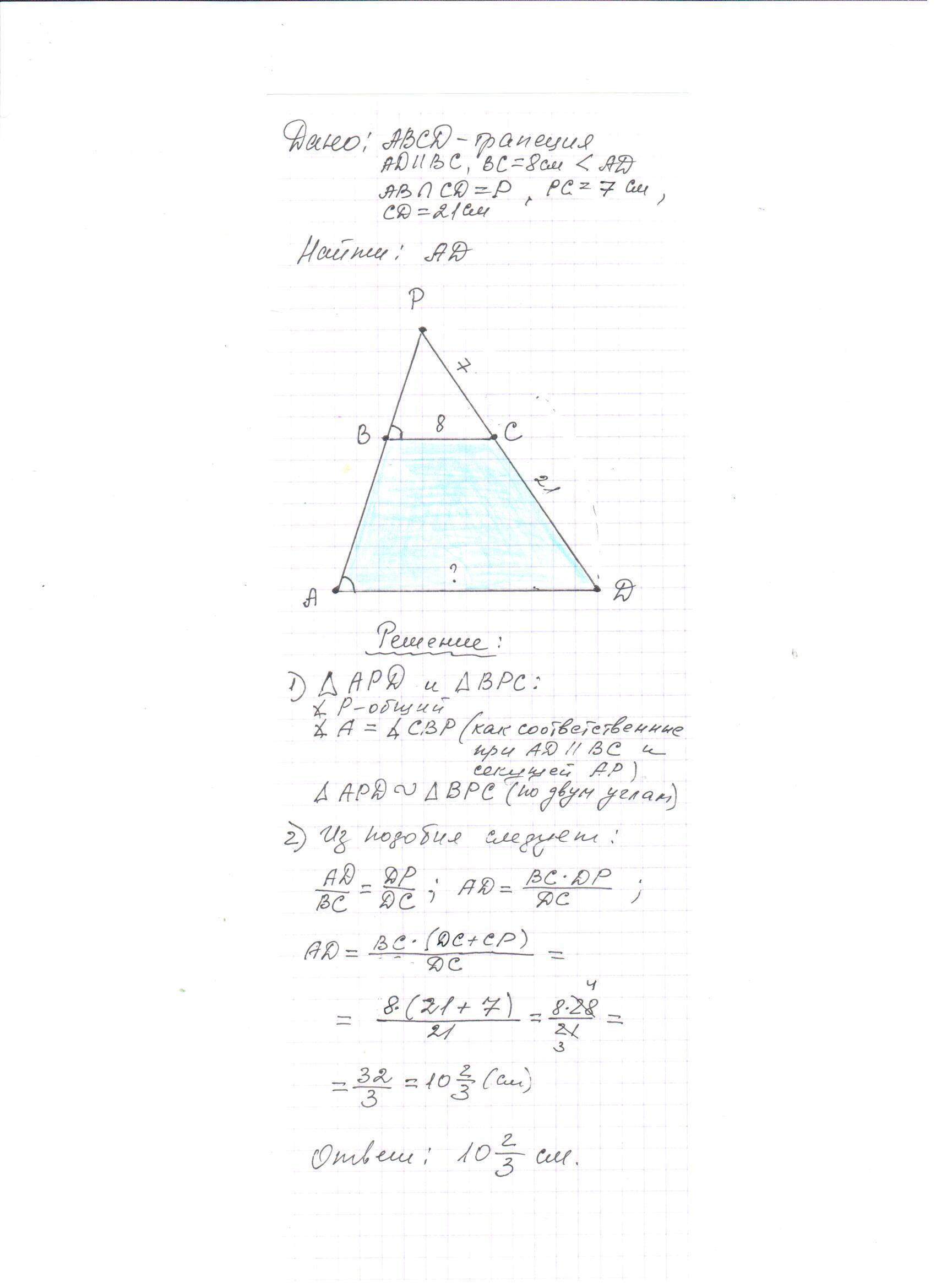 Продолжения боковых сторон ABиCD трапецииABCDпере сикаются в точке р.Меньшее основание BCравно 8см PC=7см CD=21см найдити большее основание трапеции