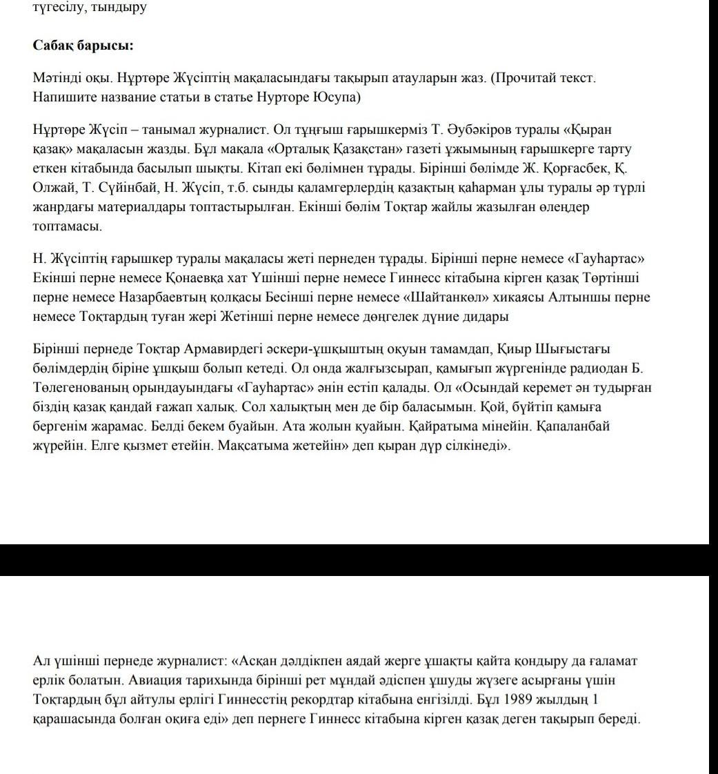 ♥️♥️❤️❤️♥️Мәтінді оқы. Нұртөре Жүсіптің мақаласындағы тақырып атауларын жаз. (Прочитай текст. Напишите название статьи в статье Нурторе Юсупа)