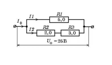 силу тока в амперах в неразветвленной части цепи I0. Значение общего напряжения на участке, а также значение сопротивления каждого резистора (в омах) указано на рисунке.