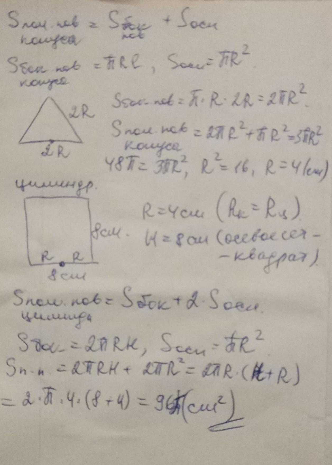 Осьовим перерізом циліндра є квадрат а Осьовим перерізом конуса рівносторонній трикутник . Знайдіть площу повної поверхні циліндра якщо радіус основ циліндра і конуса рівні а площа повної поверхні конуса дорівнює 48 пі см^2.