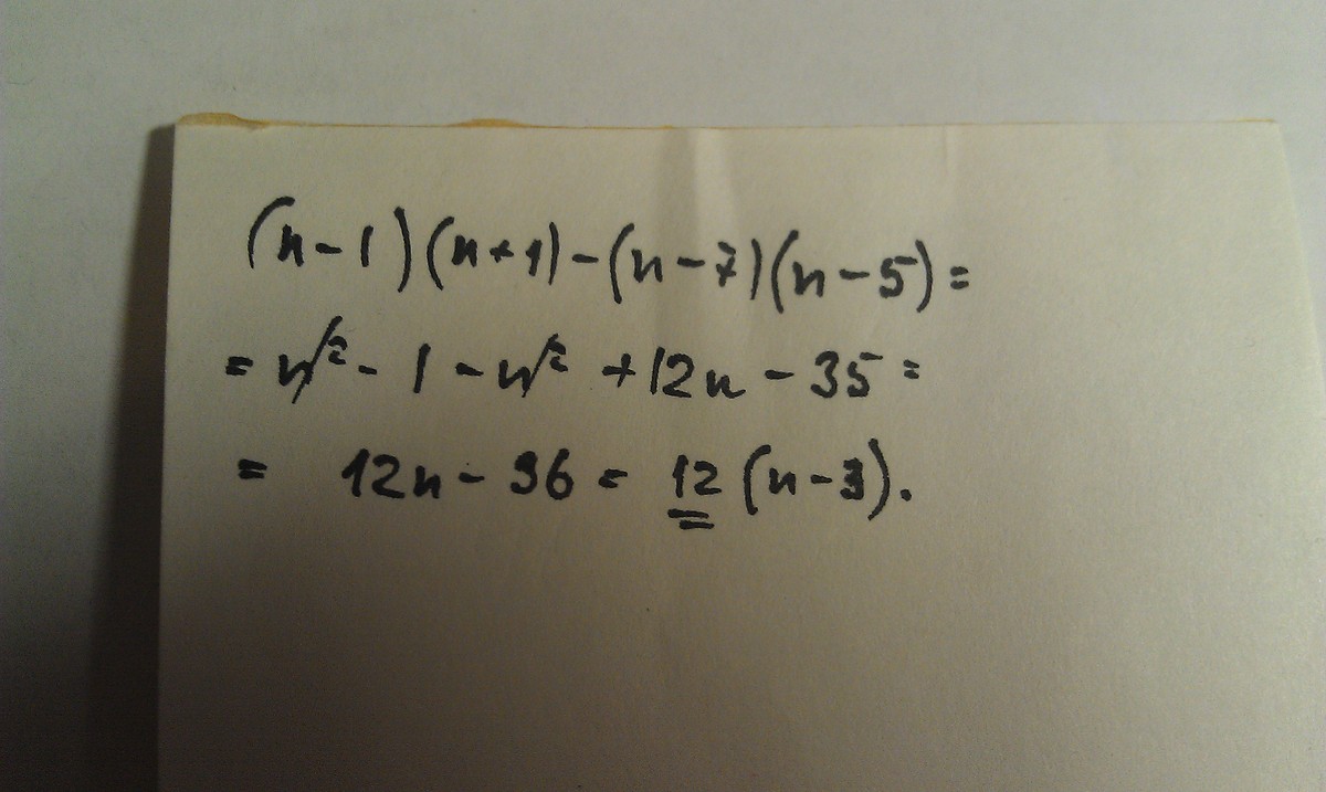 доказать, что для любого натурального n значение выражения (n-1)(n+1)-(n-7)(n-5) кратно числу 12.