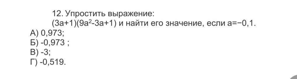 (3a+1)(9a^2-3a+1)=(3a)^3 + 1^3=27a^3 + 1 = 1-0,027=0,973(A)