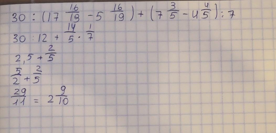 30 ÷ (17 16/19 - 5 16/19 ) + (7 3/5 - 4 4/5 ) ÷ 7 = 2 9/10