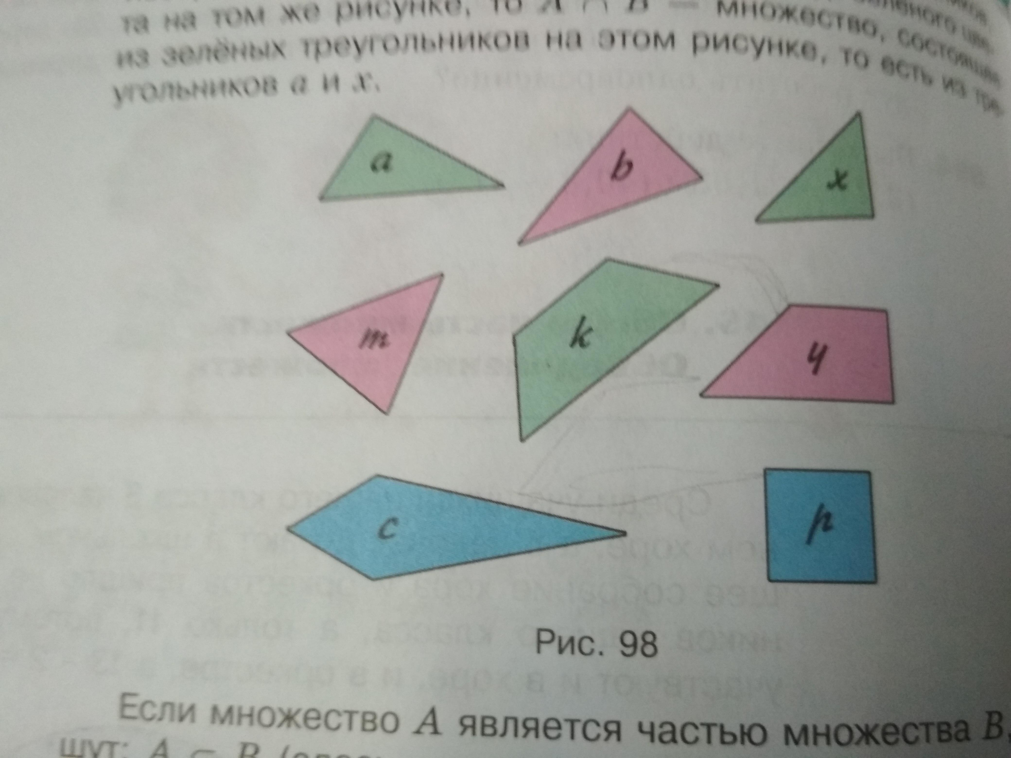 Назовите следующие части следующие части множества фигур, изображенных на рисунке 98 : а) четырехугольники б) треугольники в) многоугольники г) круги д) белые фигуры е) синие фигуры ж) красные фигуры з) зелёные фигуры