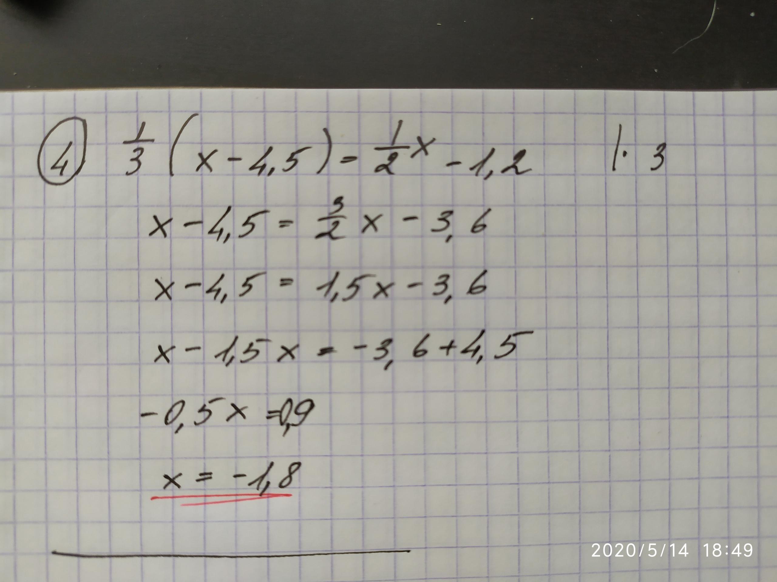 4) 1/3*x-1/3*4,5=1/2x-1,2; 1/3x-3/10=1/2x-1,2; -1/6=8/10x; x=-5/24