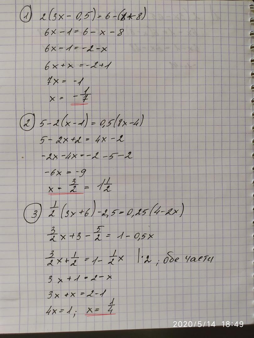 3)1/2*3x+ 1/2*6-2,5=0,25*4-0,25*2x; 3/2*x+3-2,5=1-0,5x; 2x=-0,5; x=-0,25