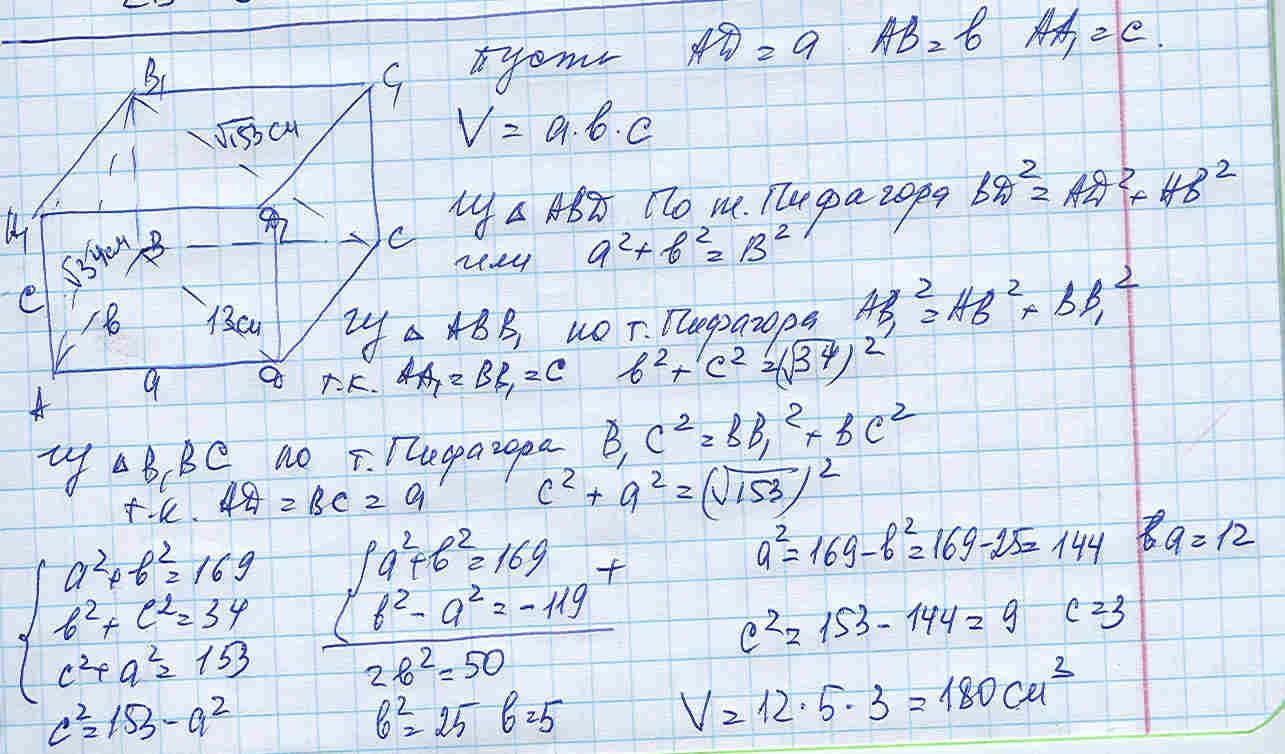 Диагональ основания прямоугольного параллелепипеда равна 13см, а диагонали боковых граней √34 см и √153см . Найдите объем параллелепипеда