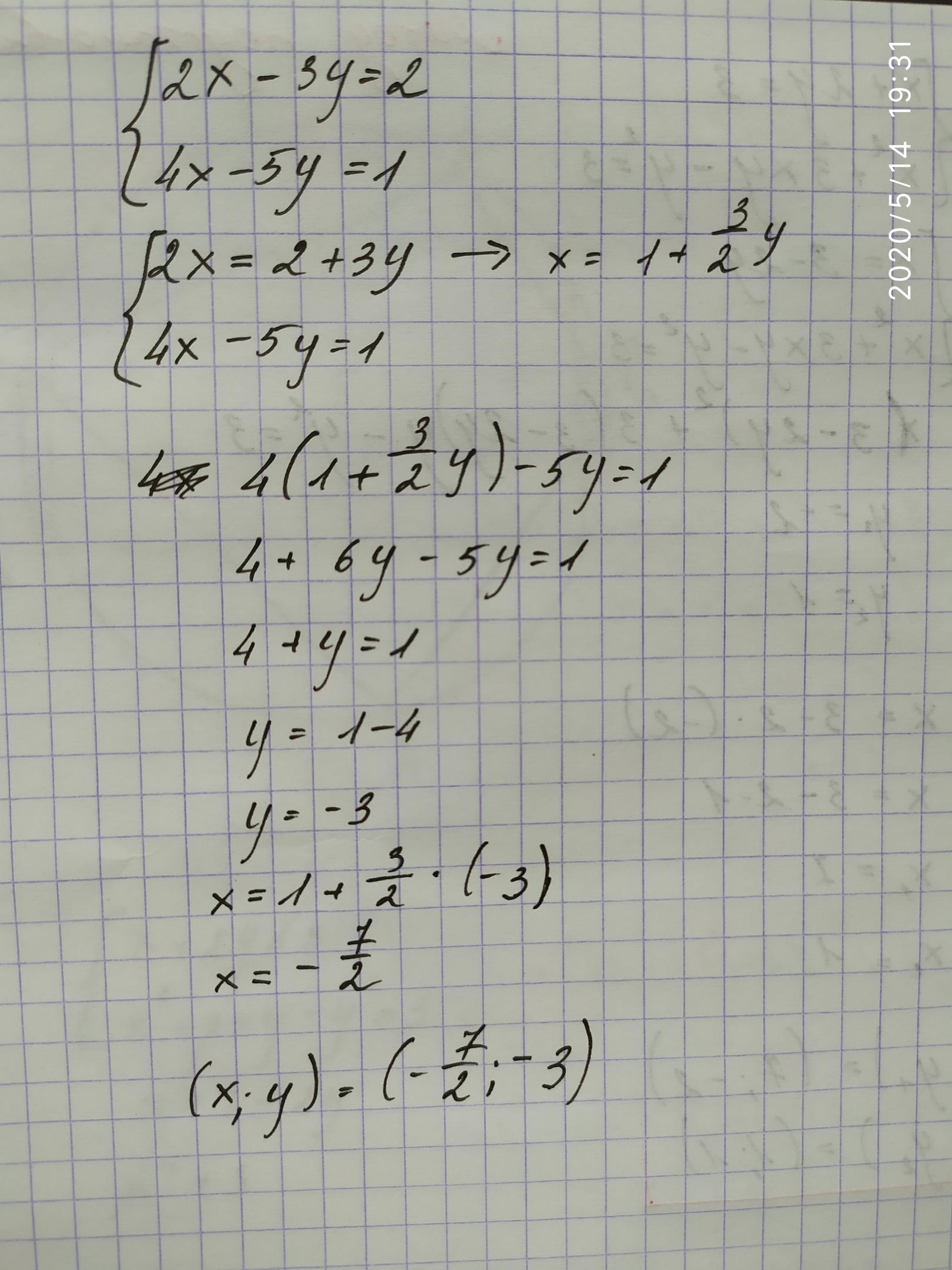 решите методом подстановки систему уравнений 2x-3y=2, 4x-5y=1