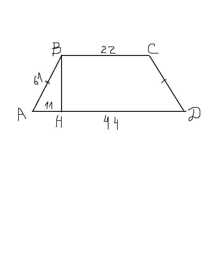 Боковая сторона равнобокой трапеции равна 61 см, а её основания равны 22 см и 44 см.