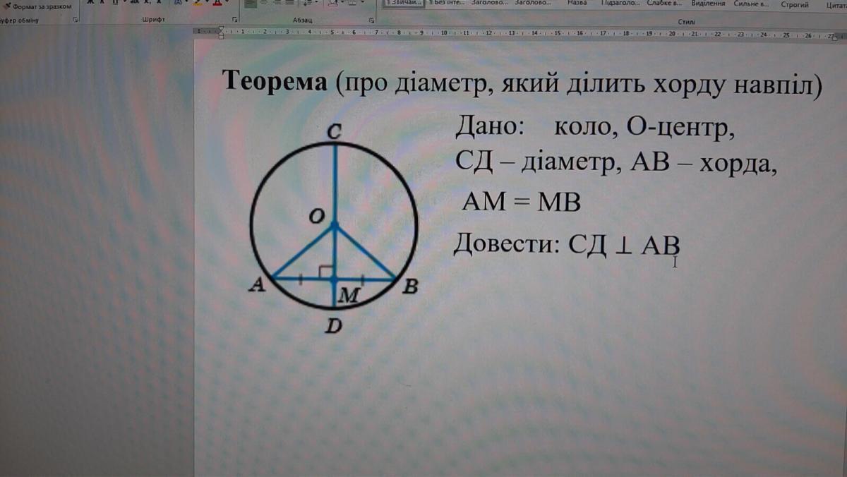 Помогите пожалуйста.Геометрия,7 класс.Нужно довести теорему.(Про диаметр,который делит хорду пополам.