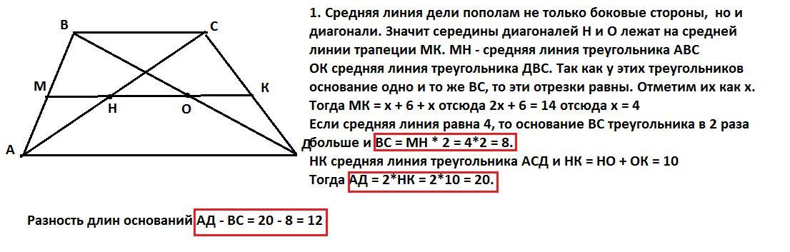 Знайдіть основи трапеції, у якої середня лінія дорівнює 14 см, а відстань між серединами діагоналей — 6 см. У відповідь запишіть різницю основ трапеції (у см).