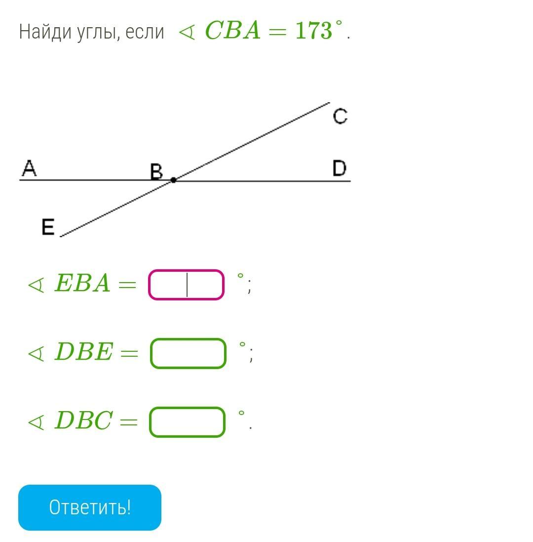 DBC=180°-173°=7°(как смежные) или <ABE=<CBD=7°(как вертикальные)