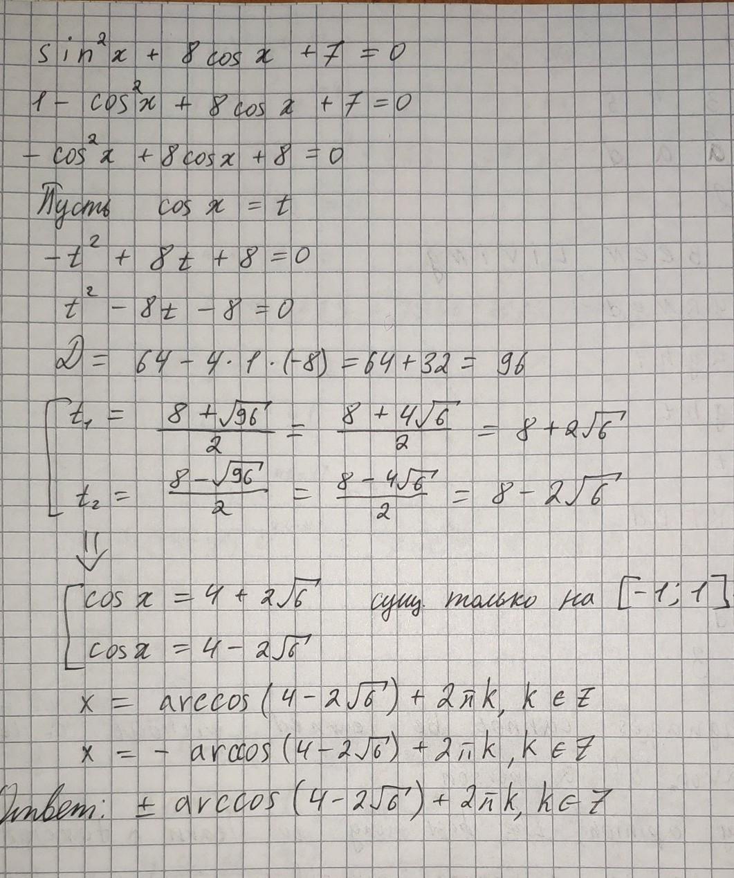 Это уравнение не имеет целочисленных ответов.(без арккосинуса) но это уравнение БУДЕТ иметь "хорошие" корни если вместо 7ми там будет 8. тогда ответ x=2πk, k€Z