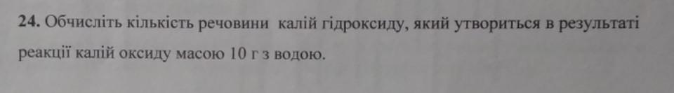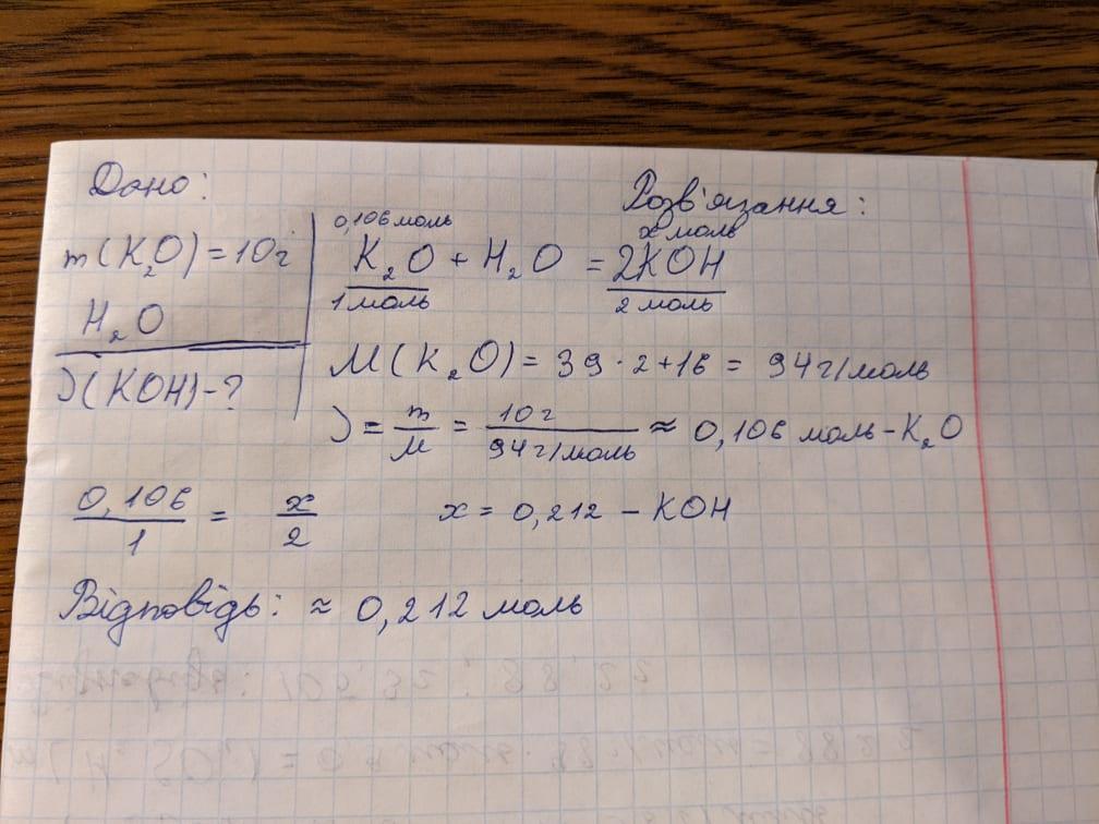 (вот перевел вам)вычислите количество вещества калий гидроксида, который образуется в результате реакции калий оксида масой 10гр с водой