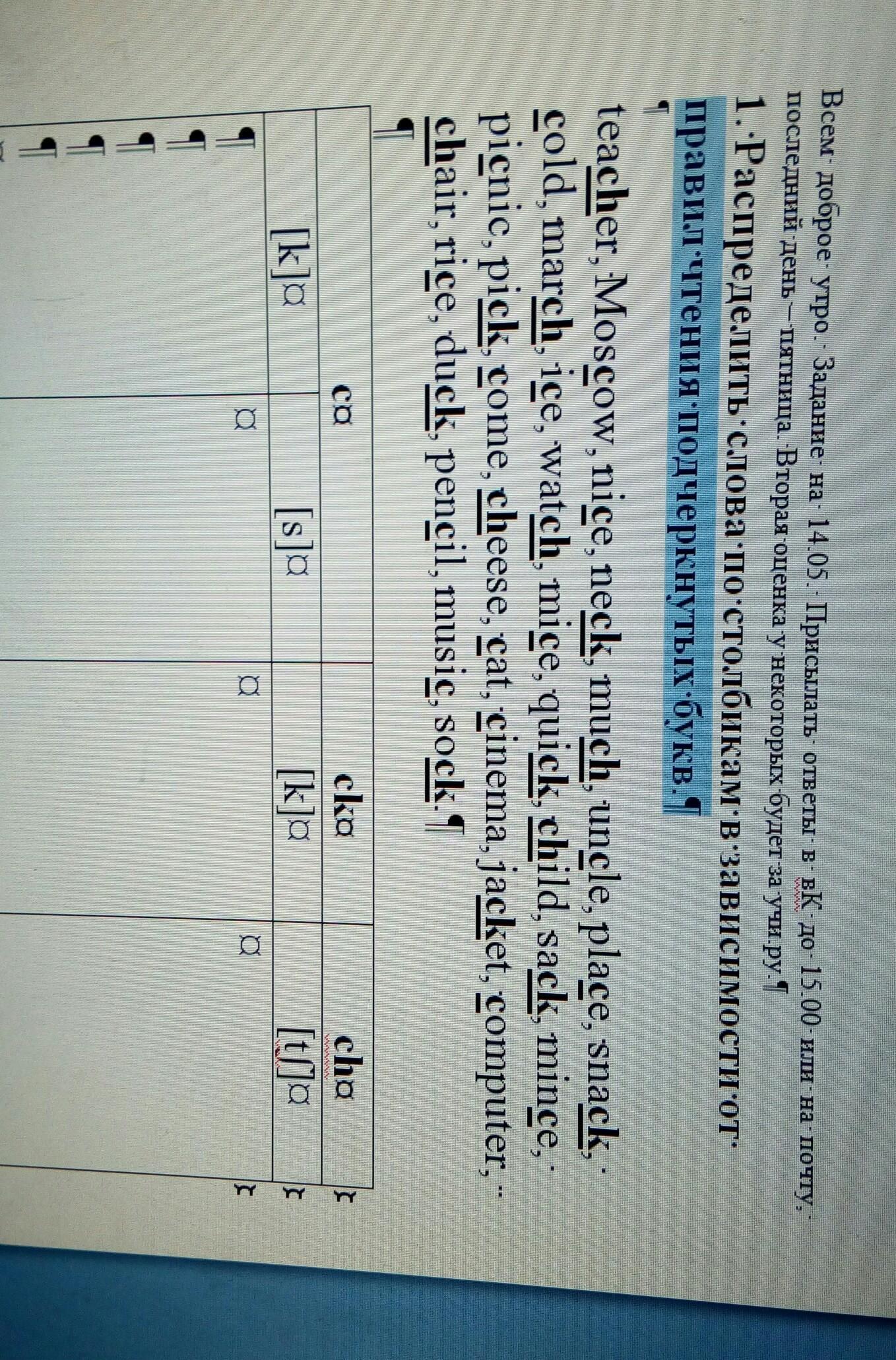 Распределите слова по столбикам в зависимости от правил чтения подчёркнутых букв teacher Moscow