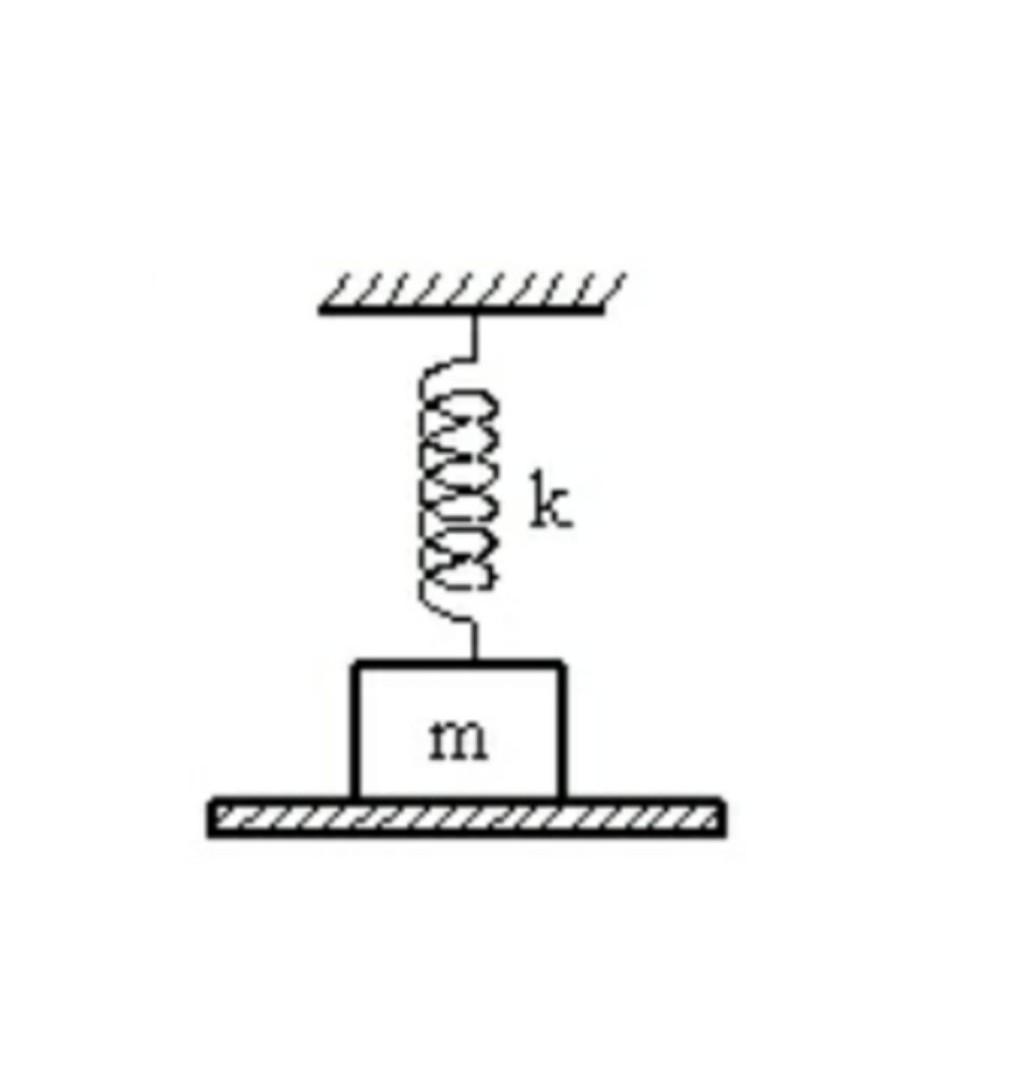 Тело массой m = 3 кг, подвешенное на пружине жёсткостью k = 600 Н/м, лежит на поверхности стола.