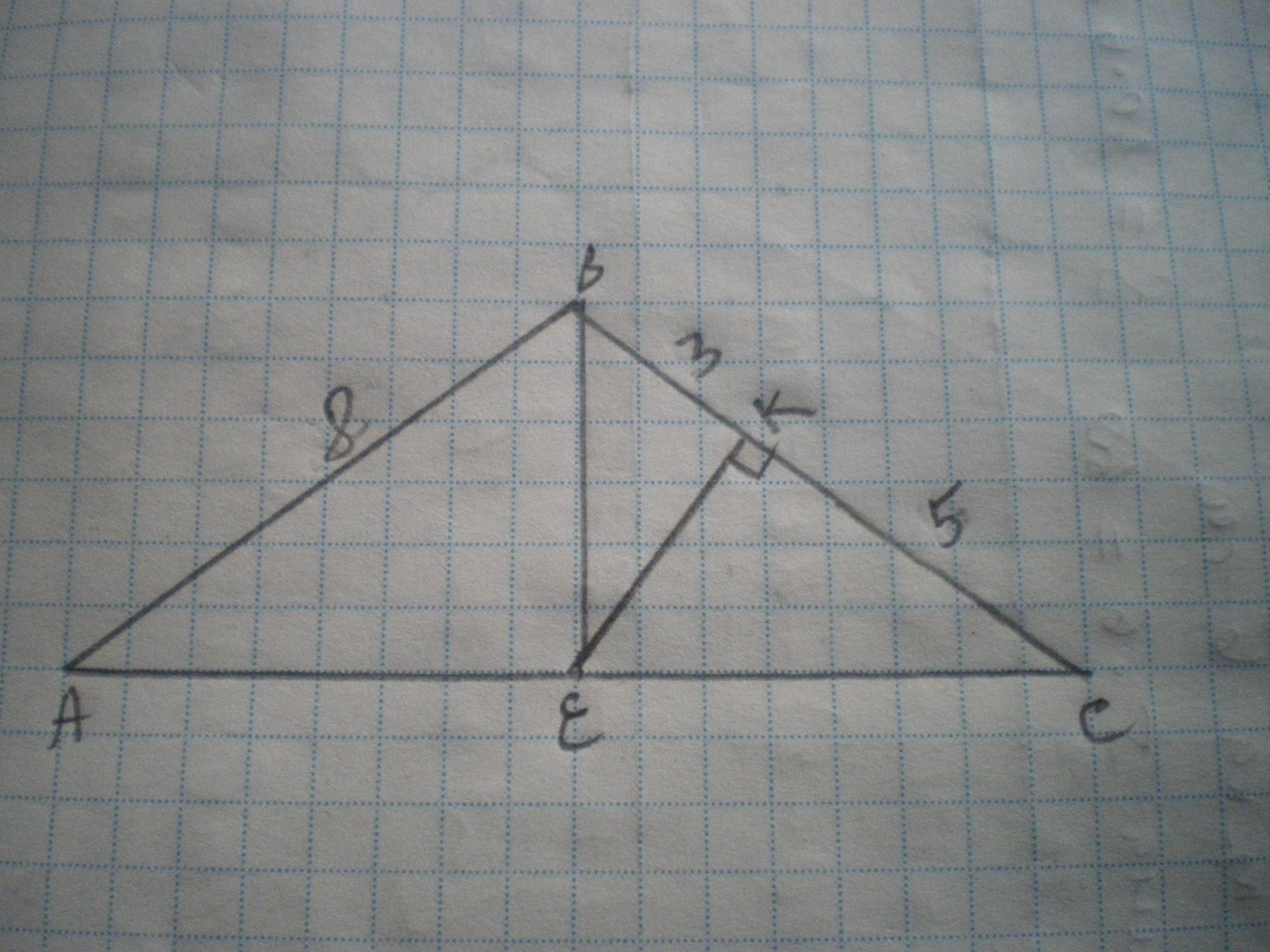 ЕК=√(ВК*КС)=√(3*5)=√15 см.
