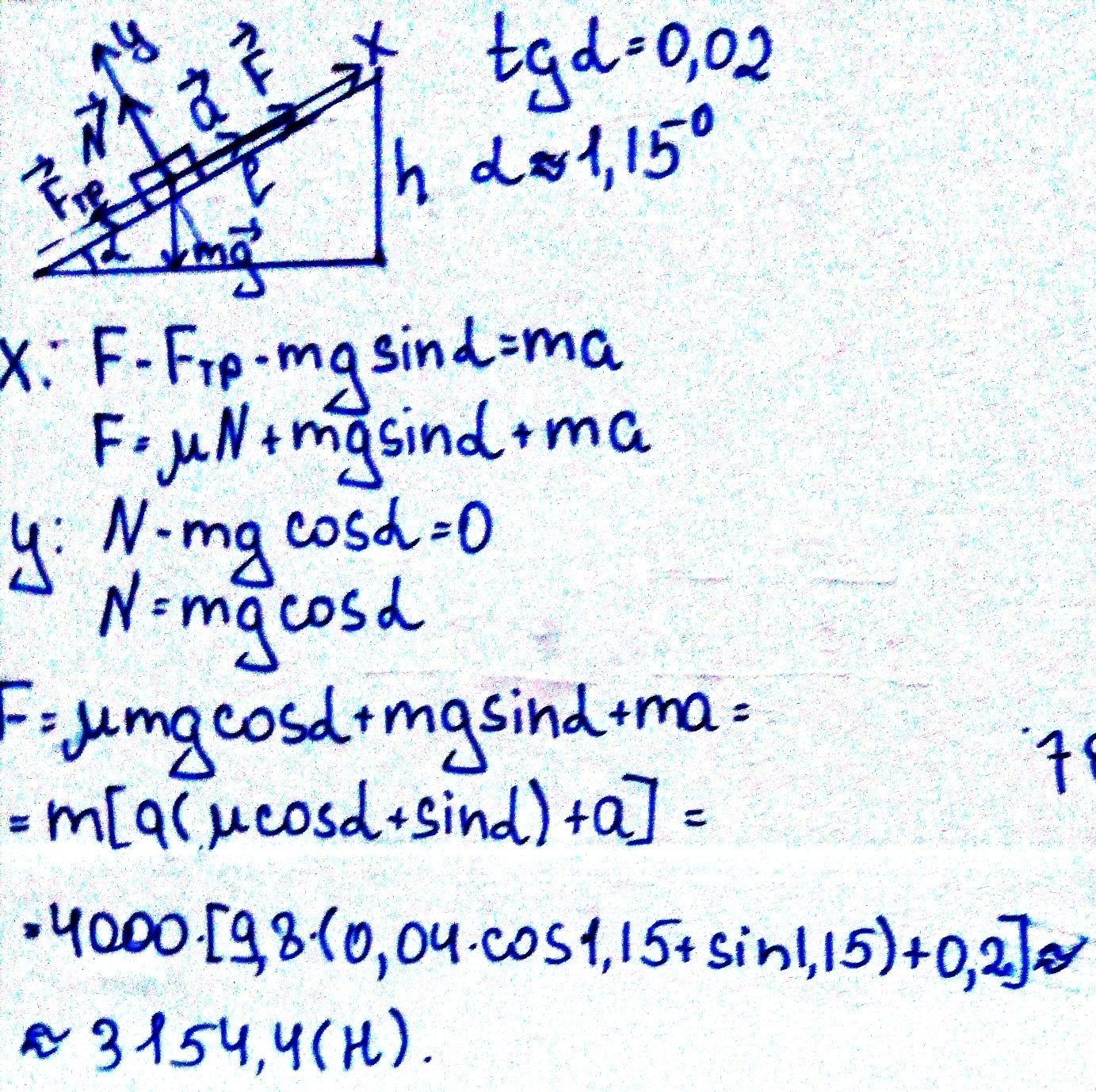 Автомобиль массой 4т движется в гору с ускорением 0,2 м/с(в квадрате). Найти силу тяги если уклон равен 0,02 а коэффициент сопротивления 0,04.