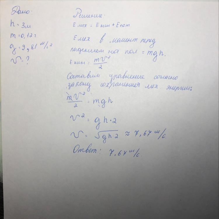 Капля воды, падает со стола, высота которого 3 м. Ее масса 0.12 грамм. Найдите ее скорость в момент перед падением на землю. Ускорение свободного падения примите равным 9,81 м/с^2
