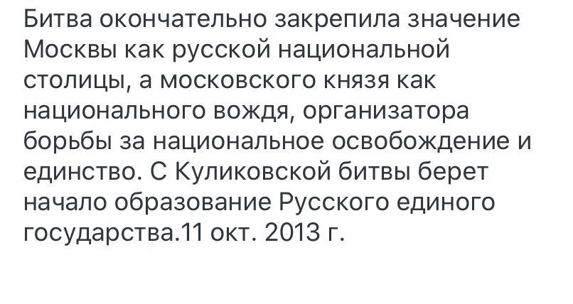 Битва окончательно закрепила значение Москвы как русской национальной столицы, а московского князя как национального вождя, организатора борьбы за национальное освобождение и единство. С Куликовской битвы берет начало образование Русского единого государства.11 окт. 2013 г.