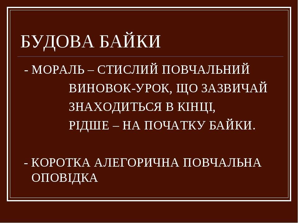 БУДОВА БАЙКИ - МОРАЛЬ – СТИСЛИЙ ПОВЧАЛЬНИЙ ВИНОВОК-УРОК, ЩО ЗАЗВИЧАЙ ЗНАХОДИТЬСЯ В КІНЦІ, РІДШЕ – НА ПОЧАТКУ БАЙКИ. - КОРОТКА АЛЕГОРИЧНА ПОВЧАЛЬНА ОПОВІДКА.