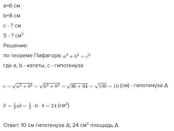 Катеты прямоугольного треугольника равны 6 и 8 см найдите гипотенузу и площадь прямоугольника . РЕБЯТА , ПОМОГИТЕ , ПОЖАЛУЙСТА!!❤️