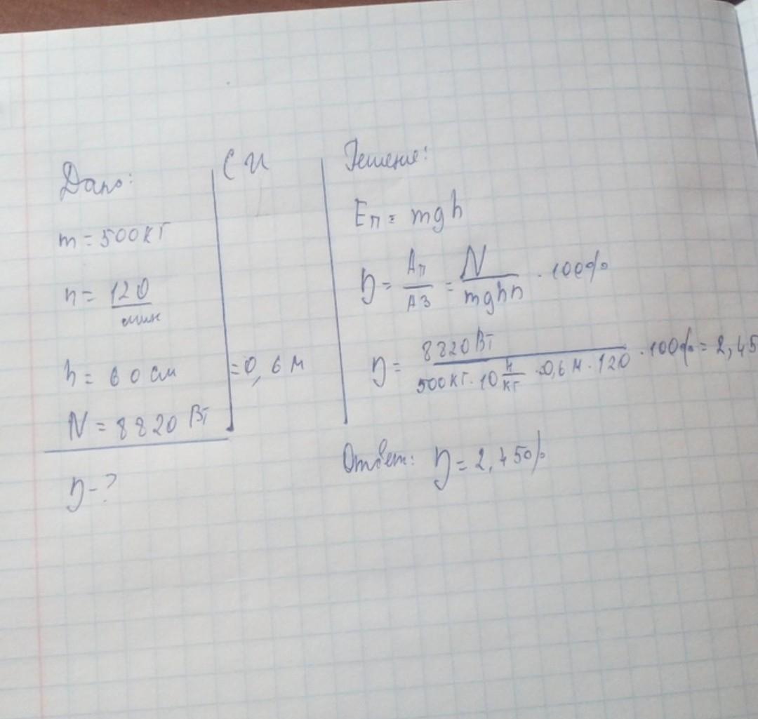решить задачу: паровая машина поднимает молот массой 500 кг 120 раз в минуту на высоту 60 см мощность машины 8,82 квг определите коэффициент полезного действия