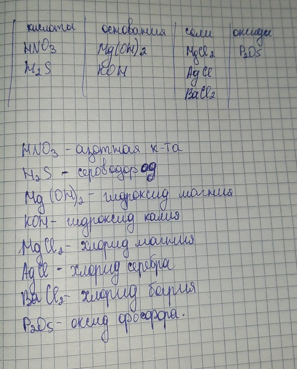 соли, оксиды): MgCl2, Р2О5, HNO3, AgCl, ВаСl2, Mg(OH)2, КОН, H2S. Назовите