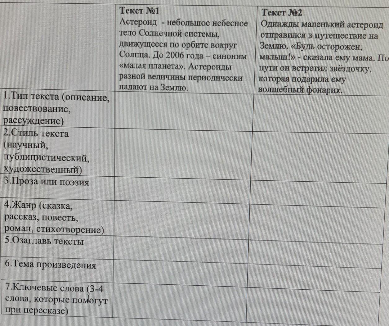 Повествование, научный стиль, проза, рассказ, название "Что такое астероид?", тема - астероид, ключевые слова - астероид - небесное тело, иногда падают на Земю, синоним "малая планета".