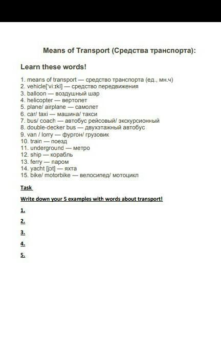 Ответ:1. I am flying on the balloon now. 2. Does she ever go to school by bike? 3. We arrived to the sea by lorry. 4. Will you fly on the plane next year? 5. He has arrived to the island by yacht.