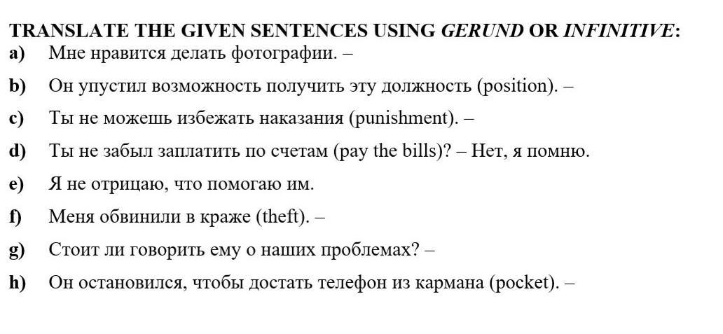 нужно перевести предложения используя при этом герундий или инфинитив.Заранее,спасибо! Кто не знает,не пишите ерунду.