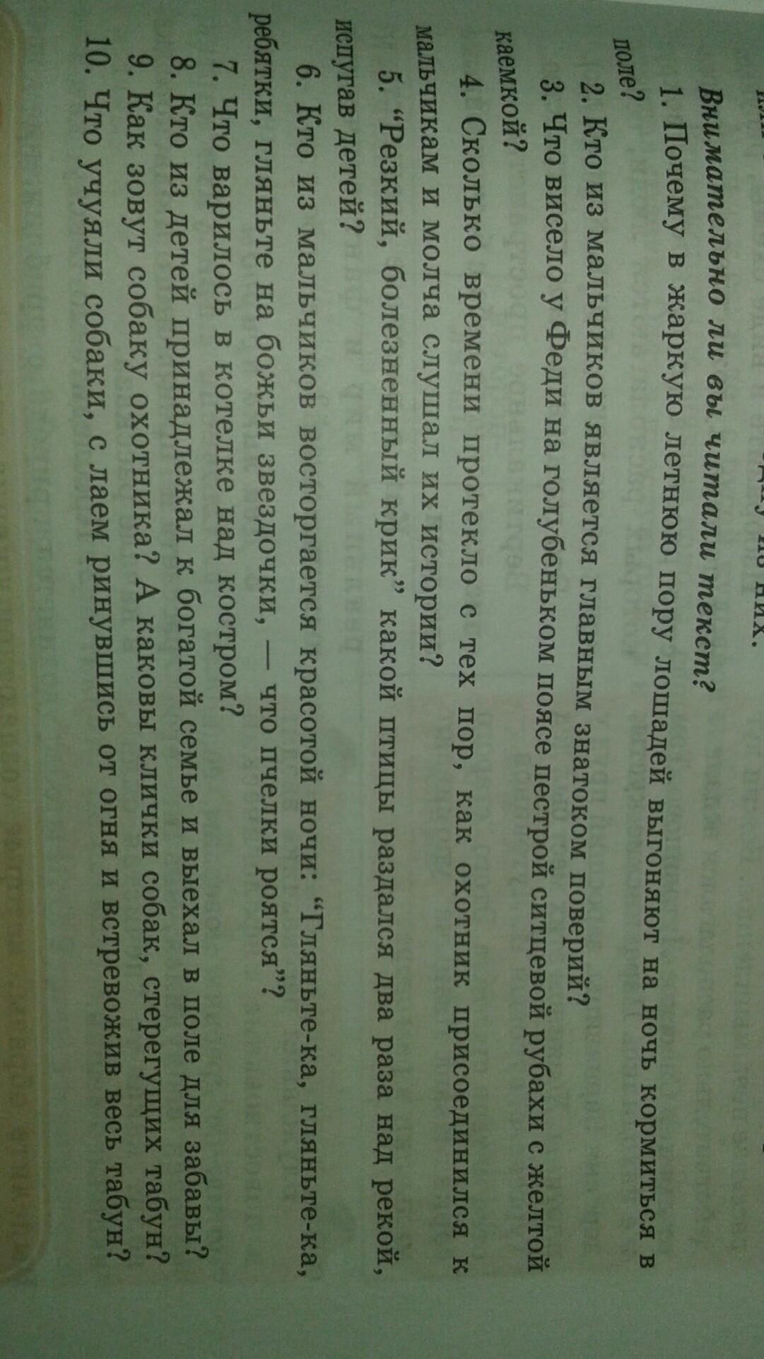 Ответ:1)потомучто ночью прохладнее и их не кусают мошки комары.) 2)Павел))3)ремень4)сутки) 5)лебеди если не ошибаюсь) 6)Павел)7)картошка)8Федя)9)птиц)