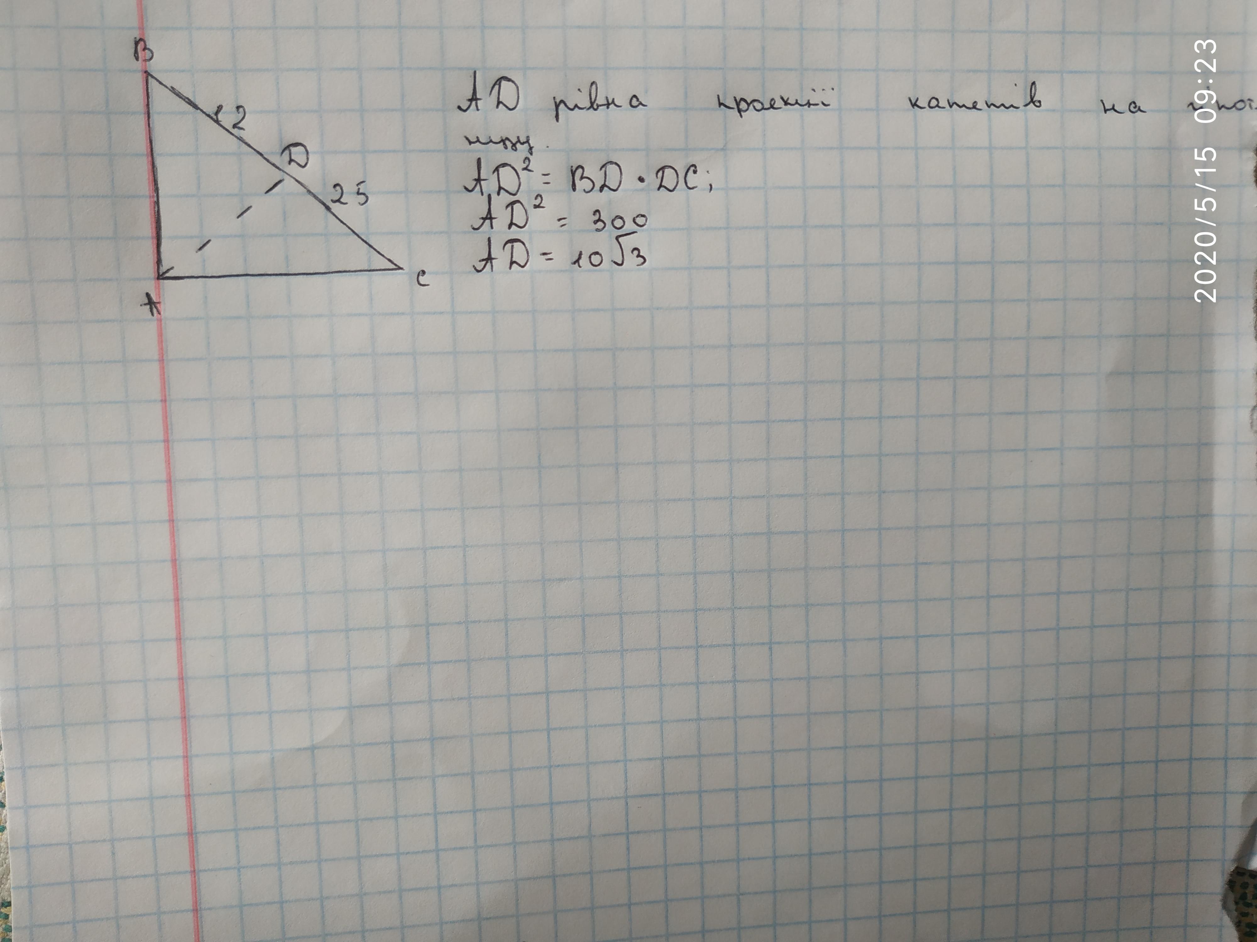 Высота прямоугольного треугольника, проведенная из вершины прямого угла, делит гипотенузу на отрезки, равные 12 и 25. Найдите высоту треугольника.
