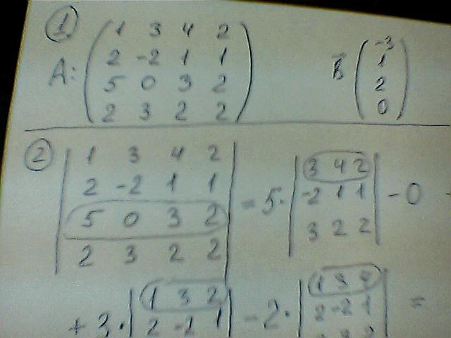 х1+ 3х2+4х3+2х4 =-3 2х1-2х2+ х3 + х4 = 1 5х1 + 3х3+2х4 = 2 2х1+3х2+ 2х3+2х4 = 0 1. Выписать матрицу коэффициентов А и свободный вектор b СЛАУ. 2. Вычислить определитель матрицы А методом ее разложения по строке или по столбцу. 3. Найти решение СЛАУ по формулам Крамера. 4. Найти решение СЛАУ методом Гаусса. 5. Каков ранг матрицы А. 6. Вычислить обратную матрицу А-1. 7. Найти решение СЛАУ с помощью обратной матрицы А-1.