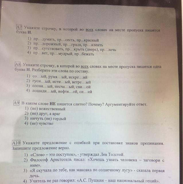 А7-3). А8-4) ЛОШАДИН-основа, ЛОШАД-корень, -ИН-суффикс, -ЫЙ-окончание; НЕФТЯН-основа, НЕФТ-корень, -ЯН-суффикс, -ОЙ-окончание; СИН-основа, корень, -ИЙ-окончание. А9-1) невежественный (без НЕ слово не употребляется). А10-3) "Я скучала по тебе, как маковка по солнечному лугу", - сказала первая дочь.