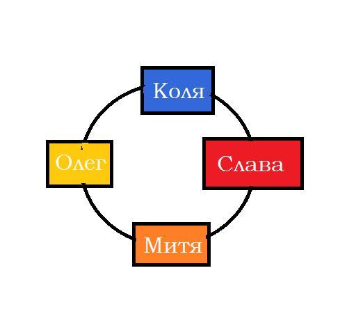 3) "Мальчик в синей футболке (это был не Митя и не Олег) стоял между мальчиками в желтой футболке и Славой". Теперь это означает, что Коля ( в синей футболке) стоял между Олегом (в желтой футболке) и Славой (у него или оранжевая, или красная )футболка.