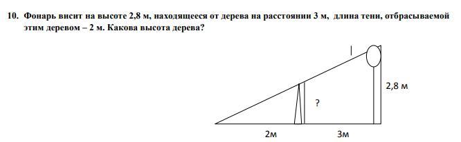 мы знаем ту сторону, которая "идет по земле": для маленького треугольника это 2м, а для большого: 2+3=5м. значит, высота фонаря к высоте дерева относятся, как 5:2