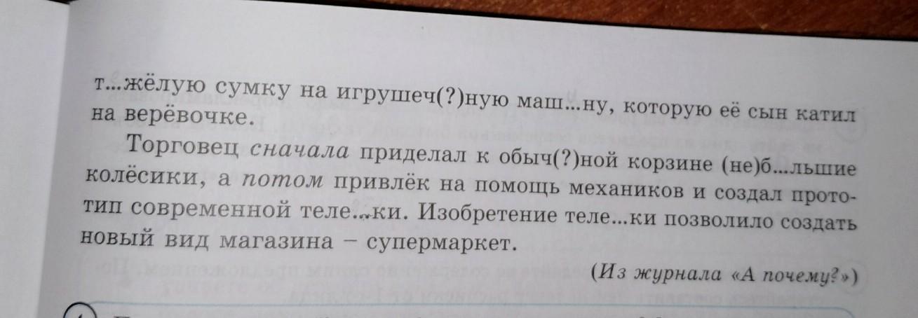 Торговец сначала (слитно, неизменяемое наречие, произошло от сущ и приставки, единственное написание - слитно, все гласные - а, запомнить, словарное слово) приделал к обыЧНой (чк, чн пишутся без ь) корзине НЕбольшие (не с прилагательным пишем слитно, если нет противопоставления, н-р, не большие, а маленькие) колёсики, а потом (неизменяемое наречие, запоминаем написание -о) привлёк на помощь механиков и зоздал прототип современной телеЖки. Изобретение телеЖки позволило создать... .