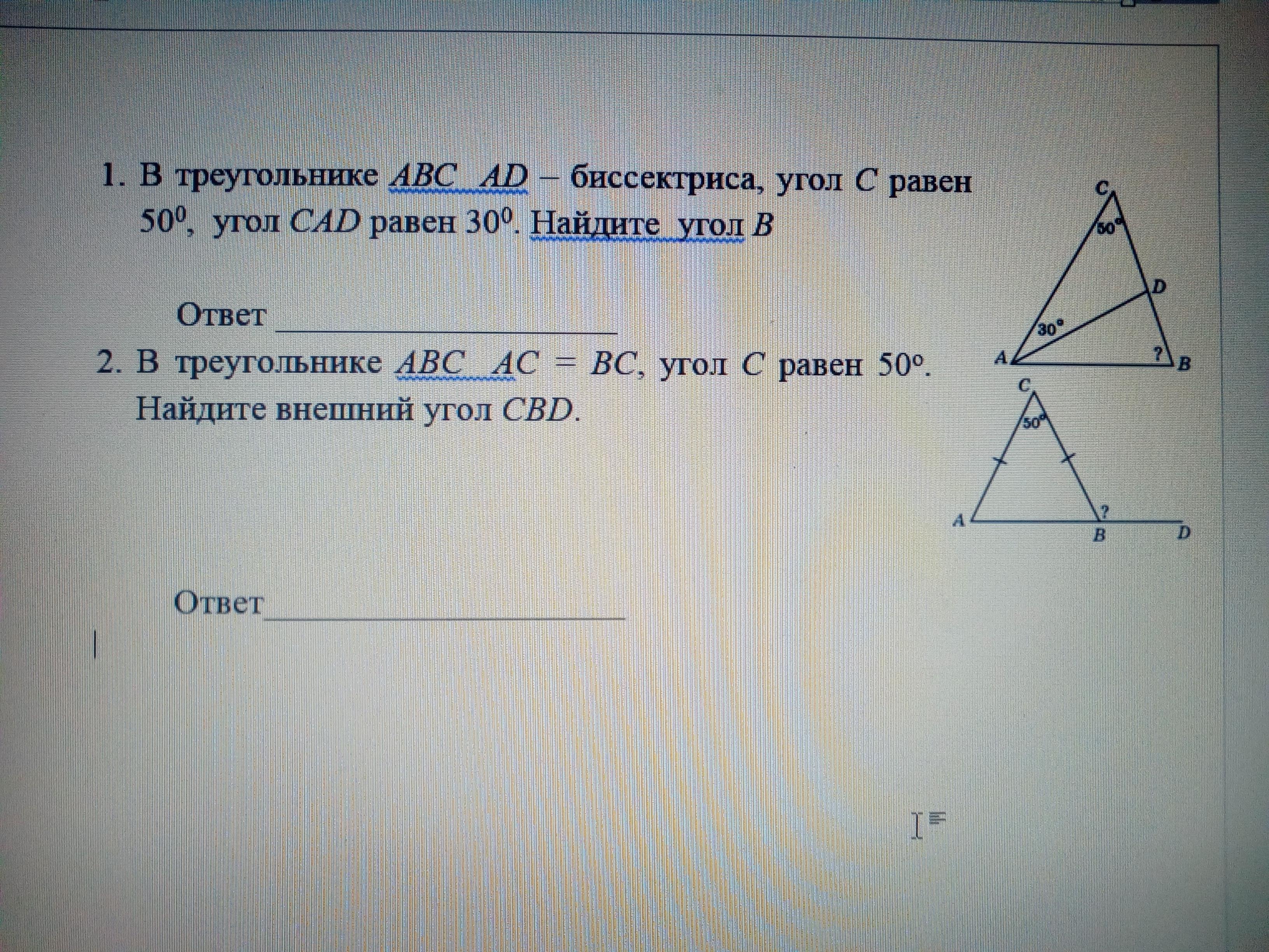 2.в равнобедренном треугольнике углы при основании равны, т.е. угол САВ=СВА=(180-угол АСВ)/2=(180-50)/2=130/2=65