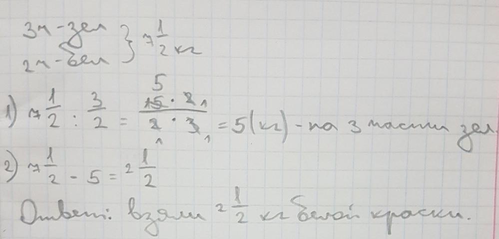 Для получения нужного оттенка на 3 части зеленой краски взяли 2 части белой. Сколько кг белой краски взяли если получили 7 целых 1/2 кг краски нужного оттенка?